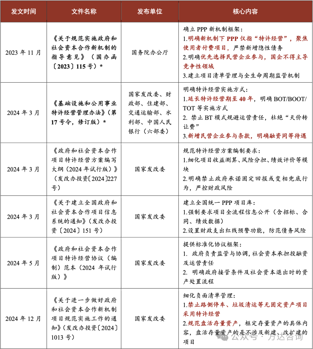 政策特征:2023年国务院发布《关于规范实施政府和社会资本合作新机制的指导意见》(国办函〔2023〕115号),建立了以使用者付费为核心的特许经营新模式。